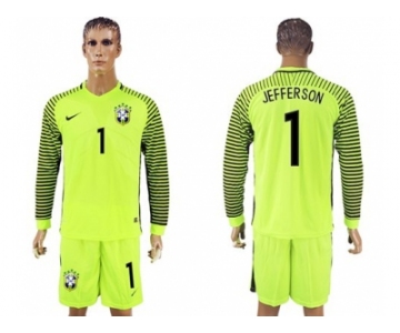 Brazil #1 Jefferson Shiny Green Long Sleeves Goalkeeper Soccer Country Jersey