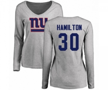 Football Women's New York Giants #30 Antonio Hamilton Ash Name & Number Logo Long Sleeve T-Shirt