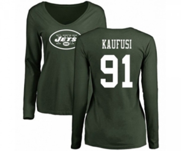 Football Women's New York Jets #91 Bronson Kaufusi Green Name & Number Logo Long Sleeve T-Shirt