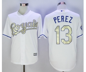 Men Kansas City Royals #13 Salvador Perez Majestic White World Series Champions Gold Program Cool Base Player Jersey