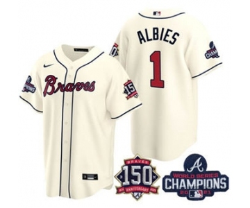 Men's Atlanta Braves #1 Ozzie Albies 2021 Cream World Series Champions With 150th Anniversary Patch Cool Base Stitched Jersey