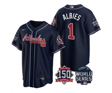 Men's Atlanta Braves #1 Ozzie Albies 2021 Navy World Series With 150th Anniversary Patch Cool Base Baseball Jersey