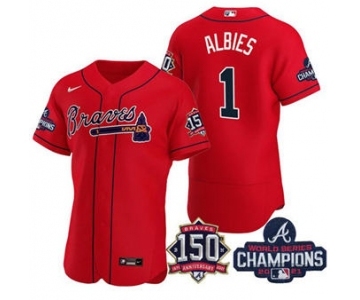 Men's Atlanta Braves #1 Ozzie Albies 2021 Red World Series Champions With 150th Anniversary Flex Base Stitched Jersey