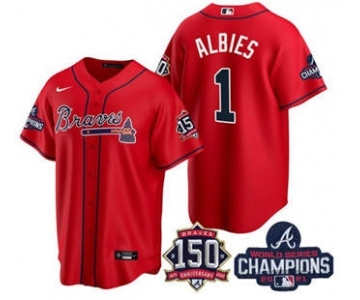 Men's Atlanta Braves #1 Ozzie Albies 2021 Red World Series Champions With 150th Anniversary Flex Base Stitched Jersey