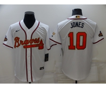 Men's Atlanta Braves #10 Chipper Jones 2022 White Gold World Series Champions Program Cool Base Stitched Baseball Jersey