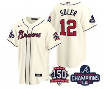 Men's Atlanta Braves #12 Jorge Soler 2021 Cream World Series Champions With 150th Anniversary Flex Base Stitched Jersey
