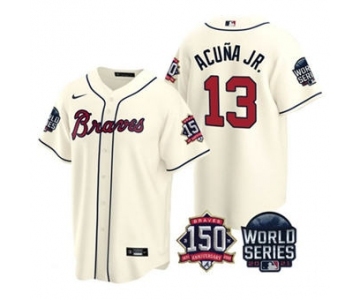 Men's Atlanta Braves #13 Ronald Acuna Jr. 2021 Cream World Series With 150th Anniversary Patch Cool Base Baseball Jersey