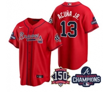 Men's Atlanta Braves #13 Ronald Acuna Jr. 2021 Red World Series Champions With 150th Anniversary Patch Cool Base Stitched Jersey