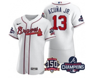Men's Atlanta Braves #13 Ronald Acuna Jr. 2021 White World Series Champions With 150th Anniversary Flex Base Stitched Jersey
