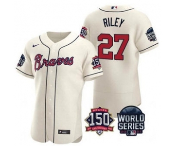 Men's Atlanta Braves #27 Austin Riley 2021 Cream World Series With 150th Anniversary Patch Flex Base Baseball Jersey