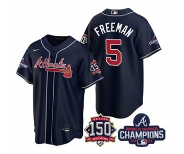 Men's Atlanta Braves #5 Freddie Freeman 2021 Navy World Series Champions With 150th Anniversary Patch Cool Base Stitched Jersey