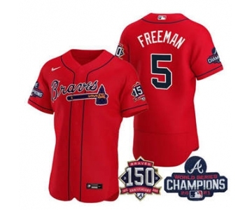 Men's Atlanta Braves #5 Freddie Freeman 2021 Red World Series Champions With 150th Anniversary Flex Base Stitched Jersey