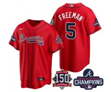 Men's Atlanta Braves #5 Freddie Freeman 2021 Red World Series Champions With 150th Anniversary Patch Cool Base Stitched Jersey