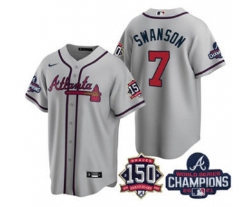 Men's Atlanta Braves #7 Dansby Swanson 2021 Gray World Series Champions With 150th Anniversary Patch Cool Base Stitched Jersey
