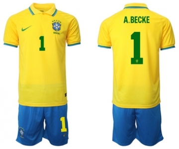 Men's Brazil #1 A. Becke Yellow Home Soccer Jersey Suit