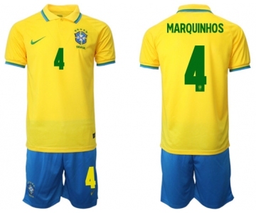 Men's Brazil #4 Marquinhos Yellow Home Soccer Jersey Suit