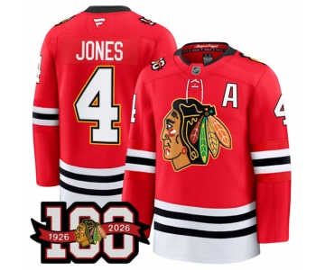Men's Chicago Blackhawks #4 Seth Jones Red 2025 Home 100th Anniversary With A Patch Stitched Hockey Jersey