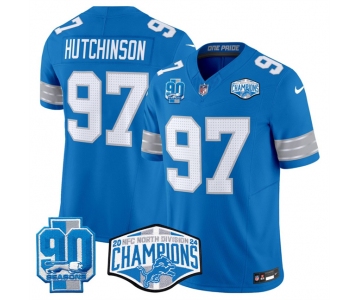 Men's Detroit Lions #97 Aidan Hutchinson Blue 2024 NFC North Champions 90th Anniversary Patch F.U.S.E. Vapor Limited Stitched Jersey