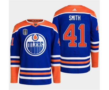 Men's Edmonton Oilers #41 Mike Smith Royal 2024 Stanley Cup Final Patch Stitched Jersey