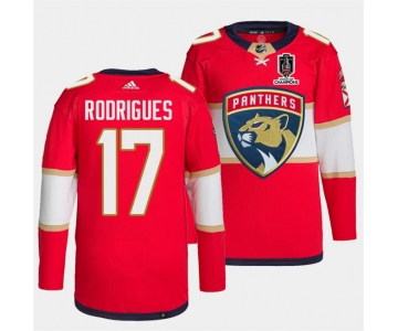 Your Position: Home>NHL Jerseys>2024 NHL Stanley Cup>Men's Panthers Stanley Cup Final>Men's Florida Panthers #17 Evan Rodrigues Red Home 2024 Stanley Cup Champions Stitched Jersey