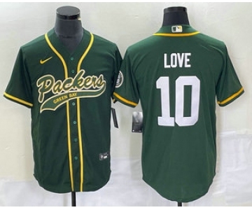 Men's Green Bay Packers #10 Jordan Love Green With Patch Cool Base Stitched Baseball Jersey