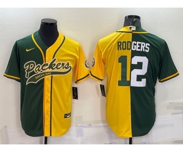 Men's Green Bay Packers #12 Aaron Rodgers Green Yellow Split With Patch Cool Base Stitched Baseball Jersey