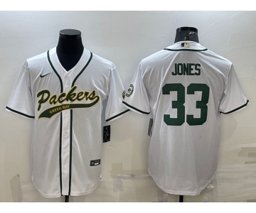 Men's Green Bay Packers #33 Aaron Jones White With Patch Cool Base Stitched Baseball Jersey