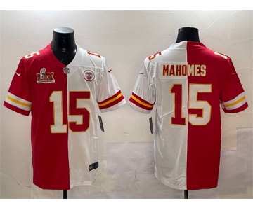Men's Kansas City Chiefs #15 Patrick Mahomes Red & White Split 2025 Super Bowl LIX Patch Vapor Limited Stitched Football Jersey