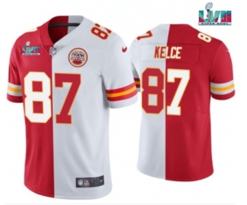 Men’s Kansas City Chiefs #87 Travis Kelce Red & White Split Super Bowl LVII Patch Limited Stitched Jersey