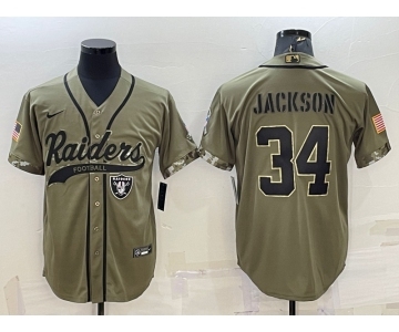 Men's Las Vegas Raiders #34 Bo Jackson 2022 Olive Salute to Service Cool Base Stitched Baseball Jersey