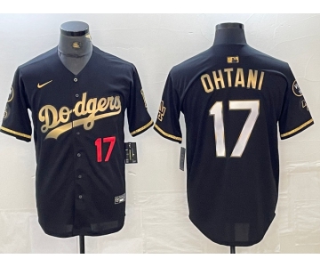 Mens Los Angeles Dodgers #17 Shohei Ohtani Number Black Gold Stitched Cool Base Nike Jersey