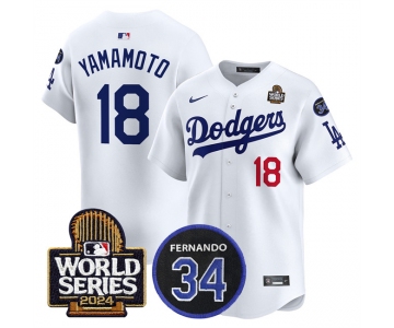 Men's Los Angeles Dodgers #18 Yoshinobu Yamamoto White 2024 World Series With Fernando Memorial Patch Limited Stitched Baseball Jersey