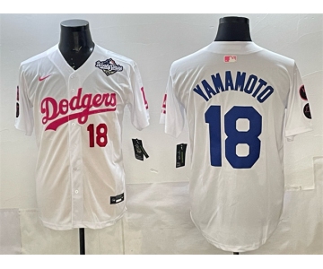Men's Los Angeles Dodgers #18 Yoshinobu Yamamoto White Pink 2025 World Series Vin & Kobe Patch Limited Stitched Baseball Jersey
