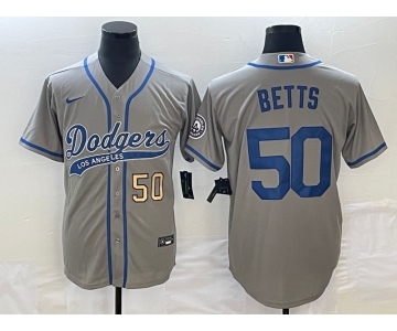 Men's Los Angeles Dodgers #50 Mookie Betts Number Grey With Patch Cool Base Stitched Baseball Jersey