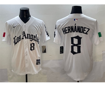 Your Position: Home>NIKE MLB Jerseys>Los Angeles Dodgers >Men>Men's Los Angeles Dodgers #8 Enrique Hernández White Mexico 2025 LA Gothic Style With Fernando Patch Vapor Premier Limited Stitched Baseball Jersey