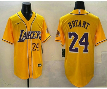 Men's Los Angeles Lakers #24 Kobe Bryant Number Yellow Purple With Patch Cool Base Stitched Baseball Jersey