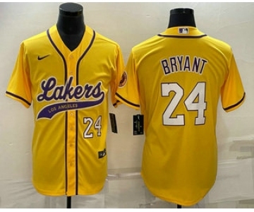 Men's Los Angeles Lakers #24 Kobe Bryant Number Yellow With Patch Cool Base Stitched Baseball Jersey