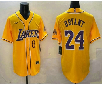 Men's Los Angeles Lakers #8 24 Kobe Bryant Yellow Purple With Patch Cool Base Stitched Baseball Jersey