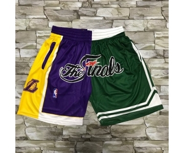 Men's Los Angeles Lakers and Boston Celtics Purle With Green 2008 The Finals Patch Split Hardwood Classics Soul Swingman Throwback Shorts