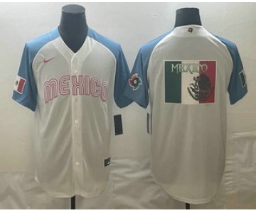 Your Position: Home>NIKE MLB Jerseys>2023 World Baseball Classic>Mexico>Men's Mexico Baseball 2023 White Blue World Big Logo Classic Stitched Jersey