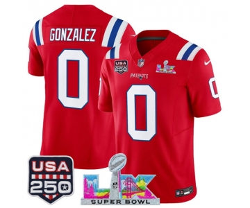 Men's New England Patriots #0 Christian Gonzalez Red 2025 F.U.S.E. Super Bowl LX Patch And USA 250' Patch Vapor Limited Football Stitched Jersey