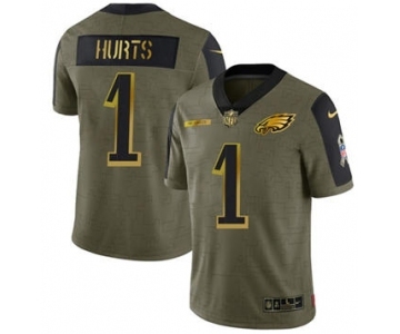 Men's Philadelphia Eagles #1 Jalen Hurts 2021 Olive Camo Salute To Service Golden Limited Stitched Football Jersey