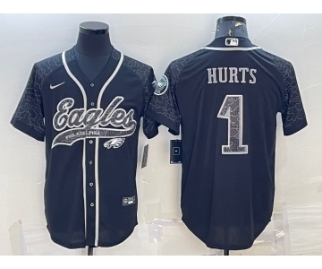 Men's Philadelphia Eagles #1 Jalen Hurts Black Reflective With Patch Cool Base Stitched Baseball Jersey