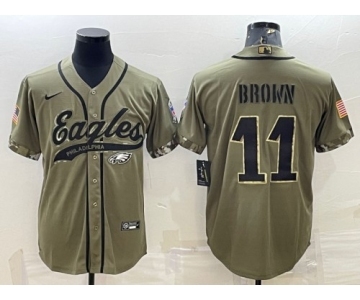 Men's Philadelphia Eagles #11 A. J. Brown Olive 2022 Salute To Service Cool Base Stitched Baseball Jersey