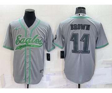 Men's Philadelphia Eagles #11 AJ Brown Grey With Patch Cool Base Stitched Baseball Jersey