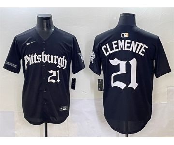 Your Position: Home>NIKE MLB Jerseys>Pittsburgh Pirates>Men>Men's Pittsburgh Pirates #21 Roberto Clemente Black 'Gothic Steel City Edition' Vapor Limited Stitched Baseball Jersey