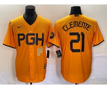 Men's Pittsburgh Pirates #21 Roberto Clemente Gold 2023 City Connect Stitched Jersey 1