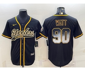 Men's Pittsburgh Steelers #90 TJ Watt Black Gold With Patch Smoke Cool Base Stitched Baseball Jersey