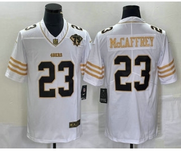 Men's San Francisco 49ers #23 Christian McCaffrey White 75th Patch Golden Edition Stitched Nike Limited Jersey