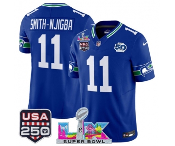 Men's Seattle Seahawks #11 Jaxon Smith-Njigba Royal 2025 F.U.S.E. Super Bowl LX Patch And 50th Season & USA 250' Patch Vapor Throwback Limited Football Sti